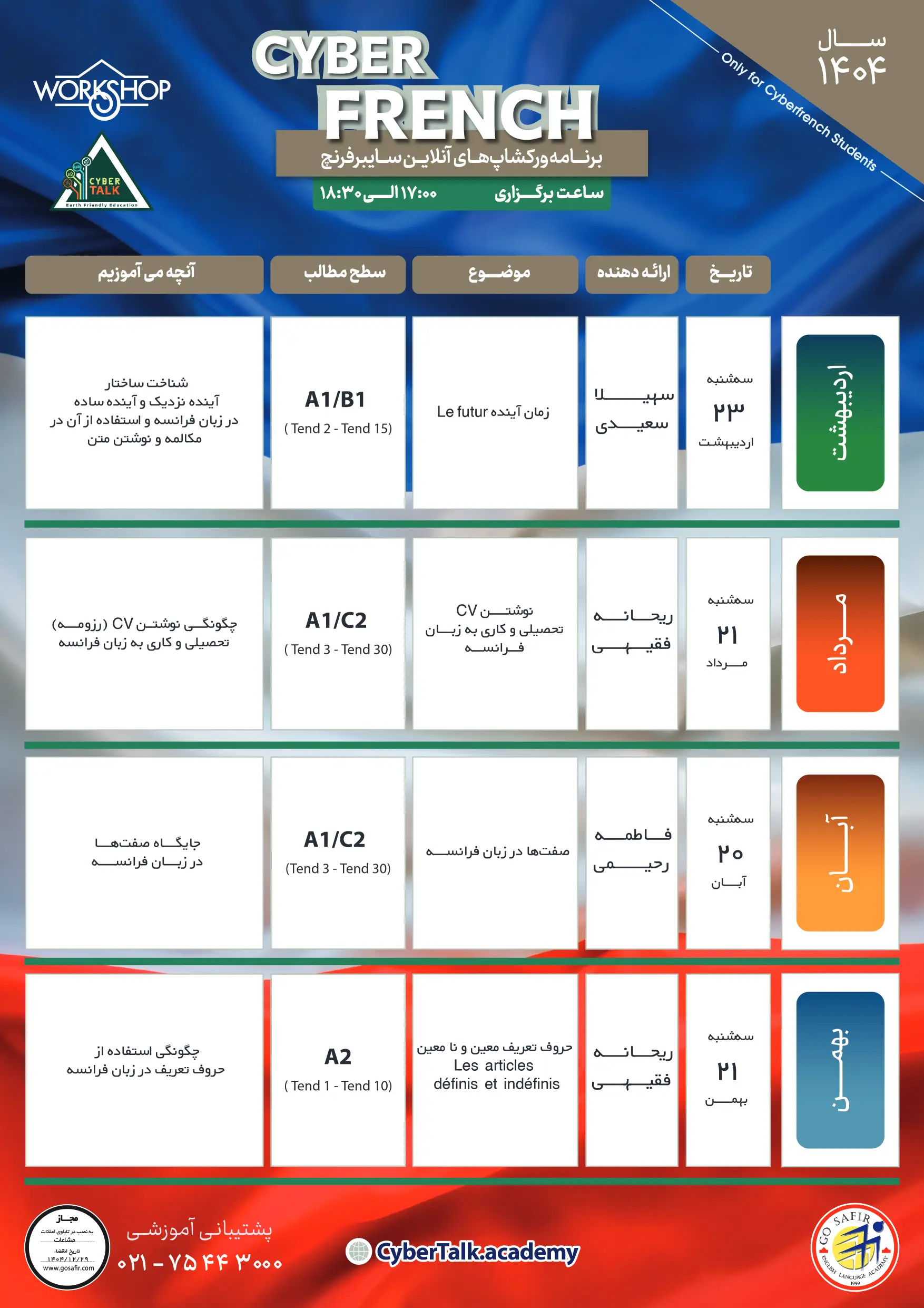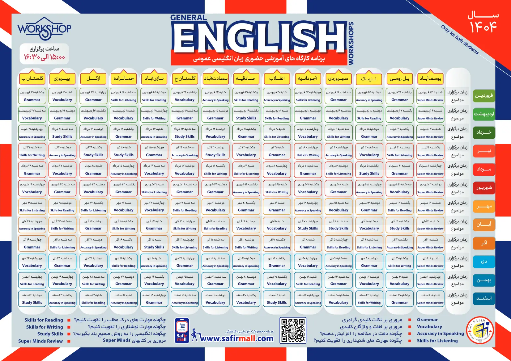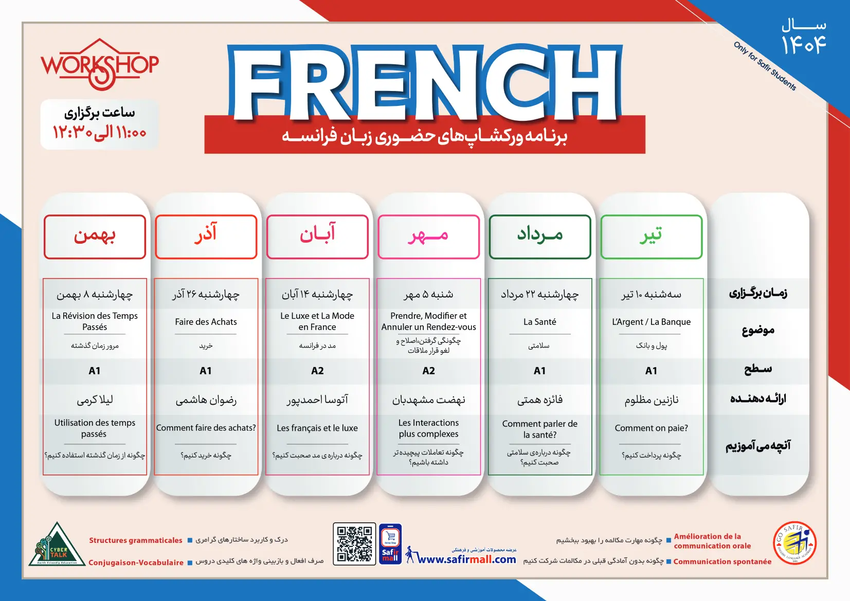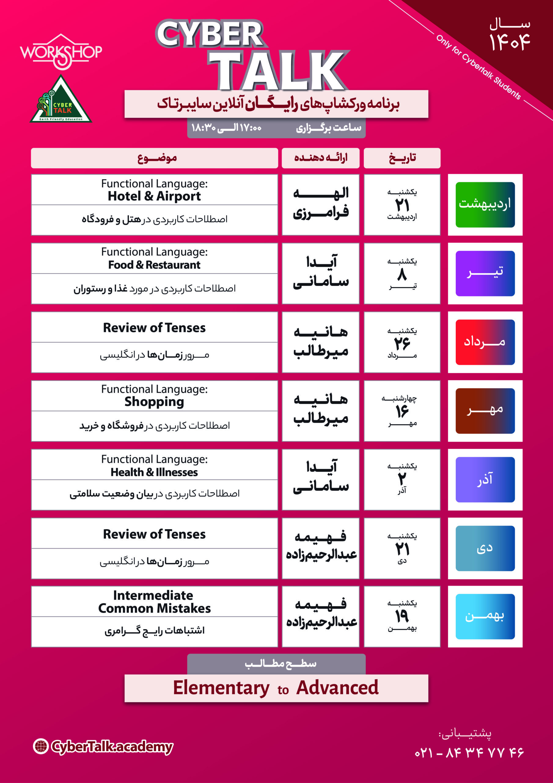 موسسه زبان سفیر گفتمان علاوه بر جلسات معمول کلاس، بر اساس نیازسنجیهای انجام شده در تمامی سطوح واحدهای مختلف، از سال ۹۷ اقدام به برگزاری کارگاههای رایگان آموزشی در کلیه شعب با موضوعات متنوع نمود.